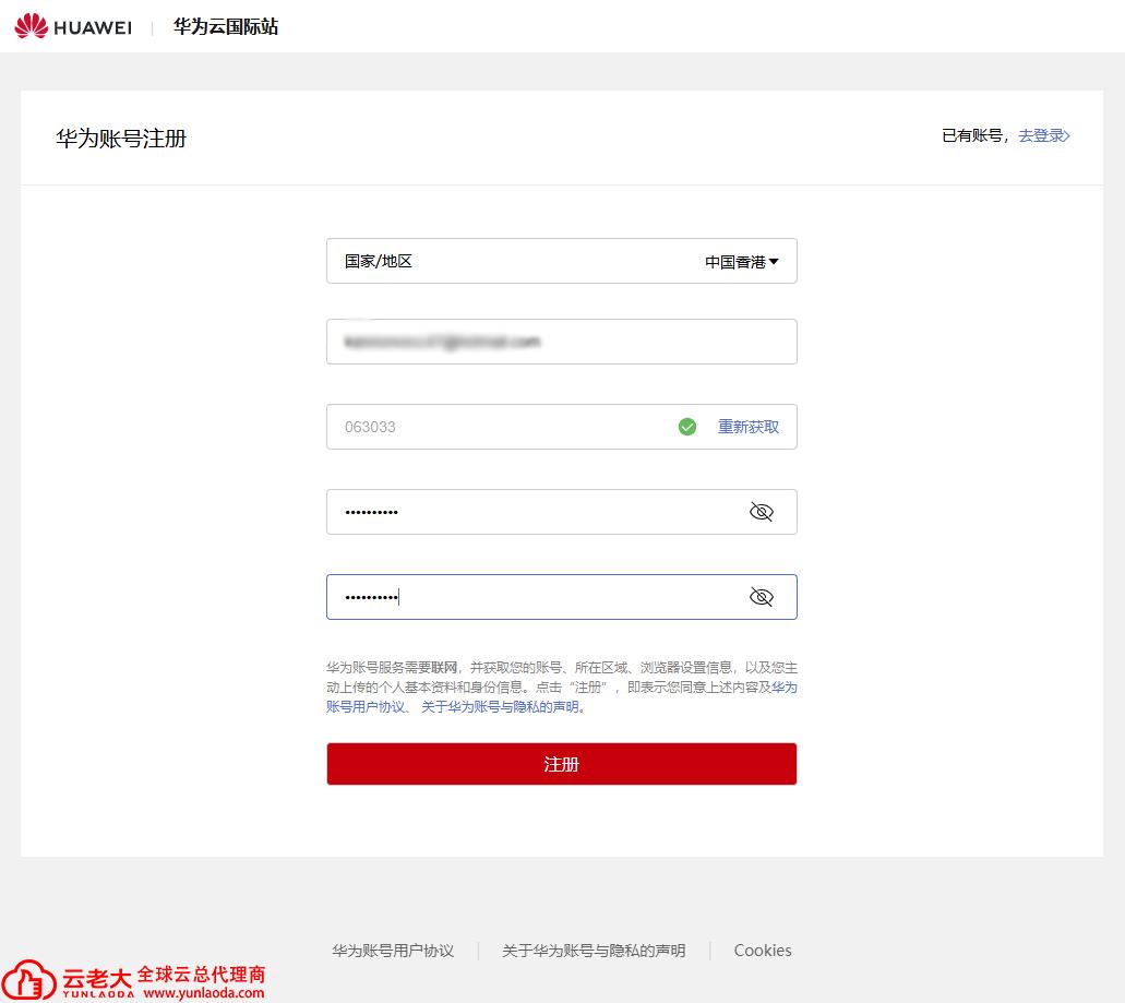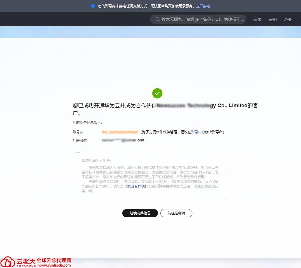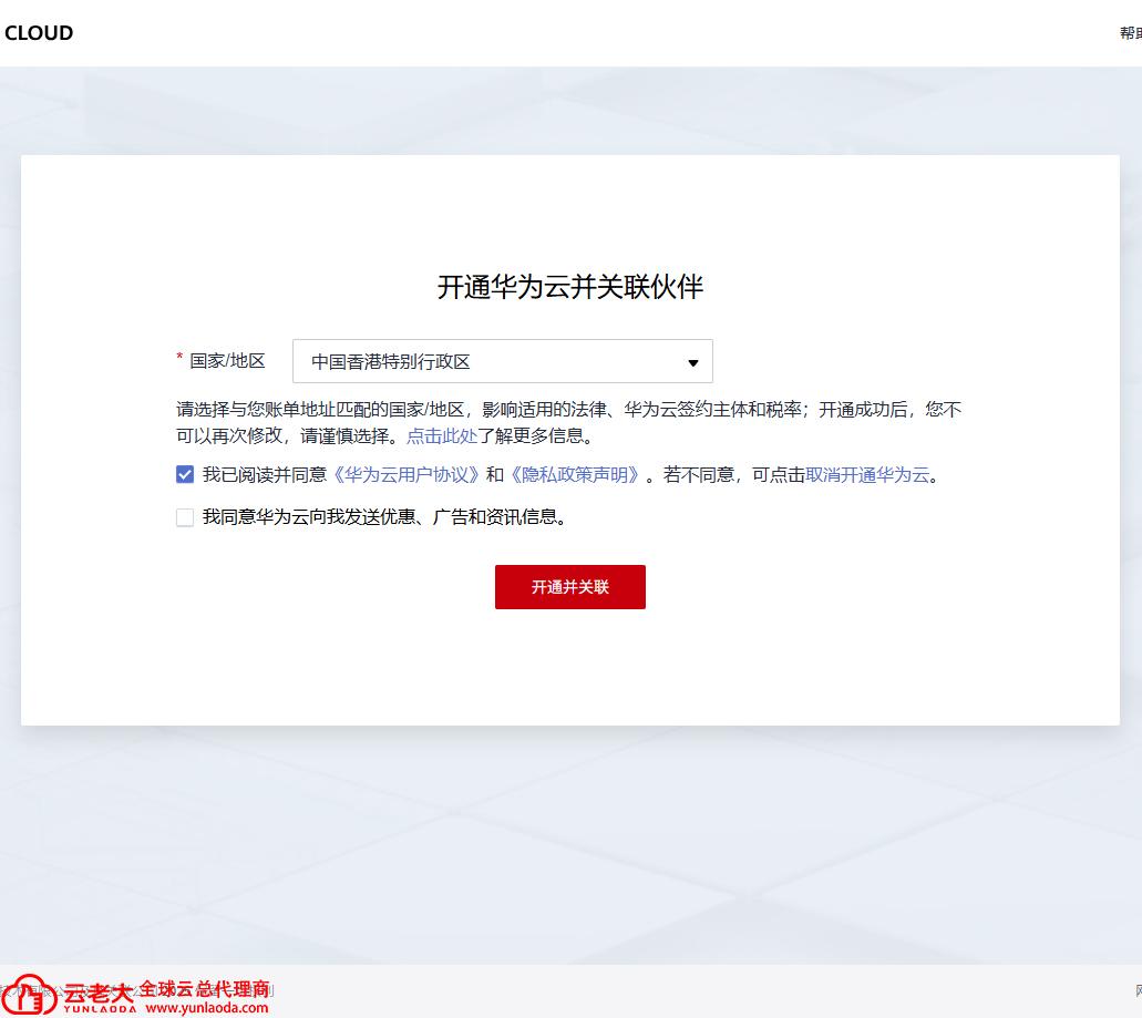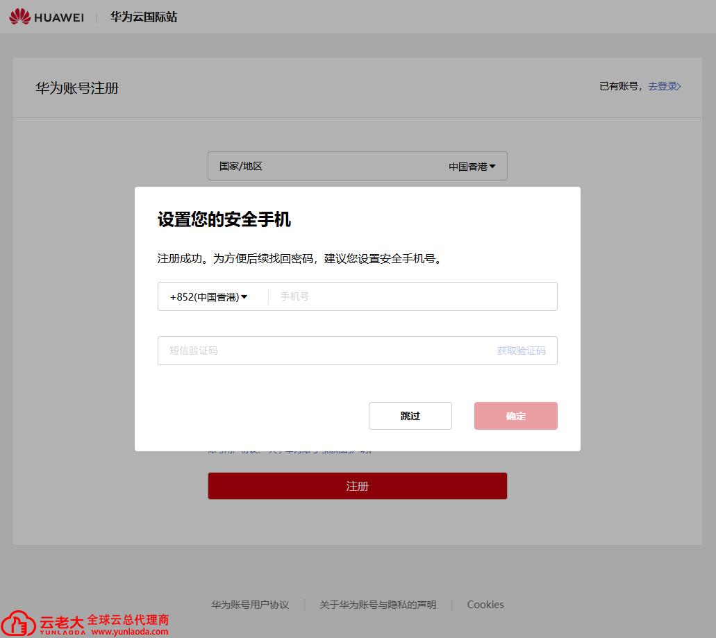 注册华为云国际站非常直观。由于国际站主要面向海外实体或出海业务,流程与国内站有所不同,建议联系华为云国际站代理商【云老大】。